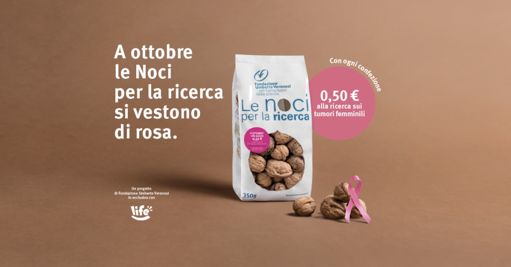 In moltissi punti vendita della grande distribuzione organizzata tornano, per tutto il mese di ottobre, "le Noci per la ricerca", il progetto di Fondazione Veronesi realizzato in collaborazione esclusiva con LIFE, che ha l'obiettivo di diffondere una maggiore attenzione verso un’alimentazione più sana come mezzo di prevenzione primaria e sostenere la ricerca scientifica.