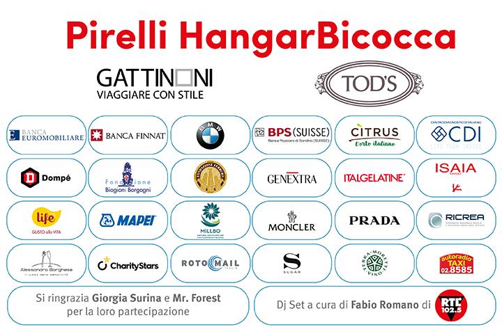 Un ringraziamento particolare per la realizzazione della serata va a Pirelli HangarBicocca, Gattinoni Viaggiare con stile, Tod’s, Banca Euromobiliare, Banca Finnat, BMW, BPS (Suisse), Citrus – L’Orto Italiano, CDI-Centro Diagnostico Italiano, Dompé, Fondazione Biagioni Borgogni, Fondazione Ferrero, Genextra, Italgelatine, Isaia, Life, Mapei, Millbo, Moncler, Prada, Ricrea, CharityStars, Rotomail, Sugar, Autoradio Taxi 02.8585, Terra Moretti Vino e RTL 102.5.
