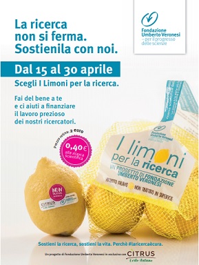 Tornano, per il quarto anno consecutivo, «I Limoni per la Ricerca» di Citrus - l’Orto Italiano, azienda ortofrutticola di Cesena da sempre al fianco di Fondazione Umberto Veronesi. Dal 15 al 30 marzo, le speciali retine da 500 grammi di limoni saranno distribuite in tutta Italia in più di 2.500 supermercati, al costo di 2 euro. Quaranta centesimi a confezione saranno devoluti a Fondazione Umberto Veronesi per finanziare la ricerca scientifica d’eccellenza.