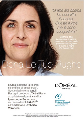 L’Oréal Paris e Coop hanno rinnovato il loro impegno a sostegno di Fondazione Umberto Veronesi, condividendo il messaggio che punta a rimarcare quanto non sia scontato arrivare a mostrare le proprie rughe, se durante la vita si ha la sfortuna di ammalarsi di cancro. «Crediamo nel grande valore della ricerca e della prevenzione e anche quest’anno abbiamo voluto promuovere questo progetto dal forte impatto sociale - afferma Guillaume Perrin, Brand Director L’Oréal Paris: azienda da anni impegnata nel sostegno alla ricerca scientifica -. La nostra azienda affonda le sue radici nella ricerca scientifica e vuole essere al fianco delle donne, affinché tutte possano guardare con serenità e fiducia verso il futuro».