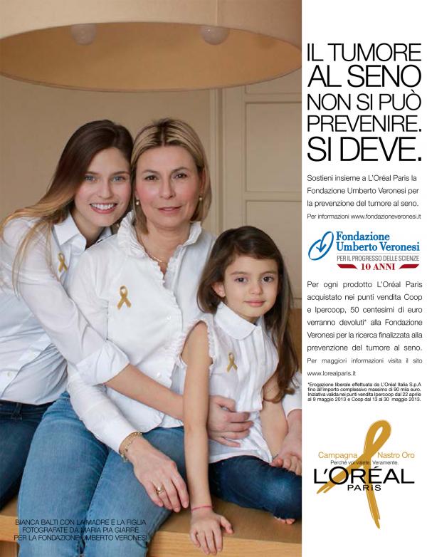 “Il tumore al seno non si può prevenire. Si deve.” Questo lo slogan della “Campagna Nastro Oro”, che racchiude i valori dell’importanza della prevenzione. Un progetto che vede protagoniste per il 2013 testimonial d’eccezione: Bianca Balti con la madre e la figlia e Cristiana Capotondi. Esempi di due donne diverse, ma ugualmente impegnate nel sociale che simboleggiano idealmente tutte le donne chiamate a sviluppare una “cultura della salute”, imparando ad ascoltare il proprio corpo e attivandosi in una prospettiva di reale prevenzione. Questo l’obiettivo della fotografa Maria Pia Giarrè che ha voluto realizzare una campagna con un mood “naturale”. La ricerca di immagini con gesti spontanei, non forzati, come per esempio il nucleo famigliare di Bianca Balti e gli scatti con luce naturale di Cristiana Capotondi, vogliono trasmettere il messaggio: “La prevenzione deve diventare un modo naturale di agire, di essere, un gesto quotidiano”.