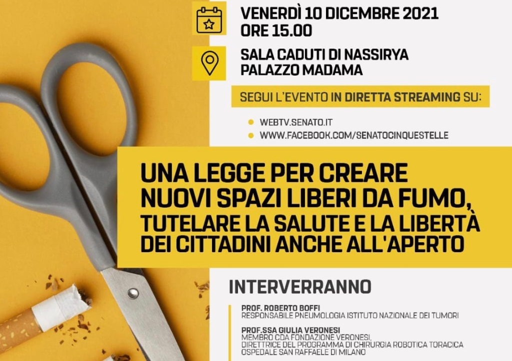 All’incontro in Senato ("Una legge per creare nuovi spazi liberi da fumo. Tutelare la salute e la libertà") partecipano Roberto Boffi, responsabile Pneumologia Istituto nazionale dei tumori di Milano, Giulia Veronesi, direttrice del programma di chirirgia robotica dell’Istituto San Raffaele di Milano. Entrambi fanno parte del Comitato scientifico per la lotta al fumo di Fondazione Umberto Veronesi. Interverranno anche Mariasofia Cattaruzza, presidente SITAB, Donatella Barus, direttrice Magazine Fondazione Veronesi, Stefano Consonni, responsabile campagna contro il fumo passivo di Ideal, il senatore Giuseppe Auddino, la senatrice Annamaria Parente, presidente Commissione igiene e sanità, il senatore Eugenio Comincini, membro della Commissione, il senatore Pierpaolo Sileri, sottosegretario di stato per la salute, la senatrice Maria Domenica Castellone, capogruppo Movimento 5 Stelle al Senato, la senatrice Anna Maria Bernini, capogruppo Forza Italia al Senato.