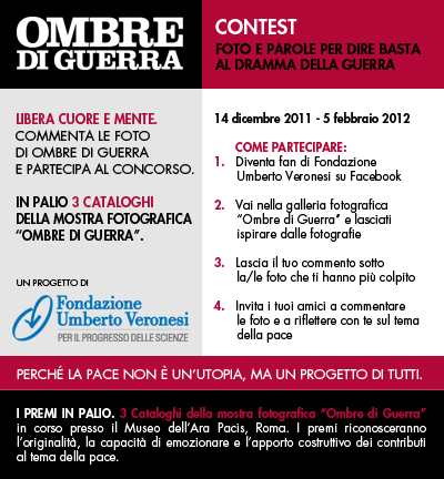 In occasione dell’inaugurazione di Ombre di Guerra a Roma, presso il Museo dell’Ara Pacis, il 14 dicembre prende il via su Facebook un contest che vi permetterà di vincere tre cataloghi della mostra. Partecipare è molto semplice. Qui di seguito il regolamento del concorso: