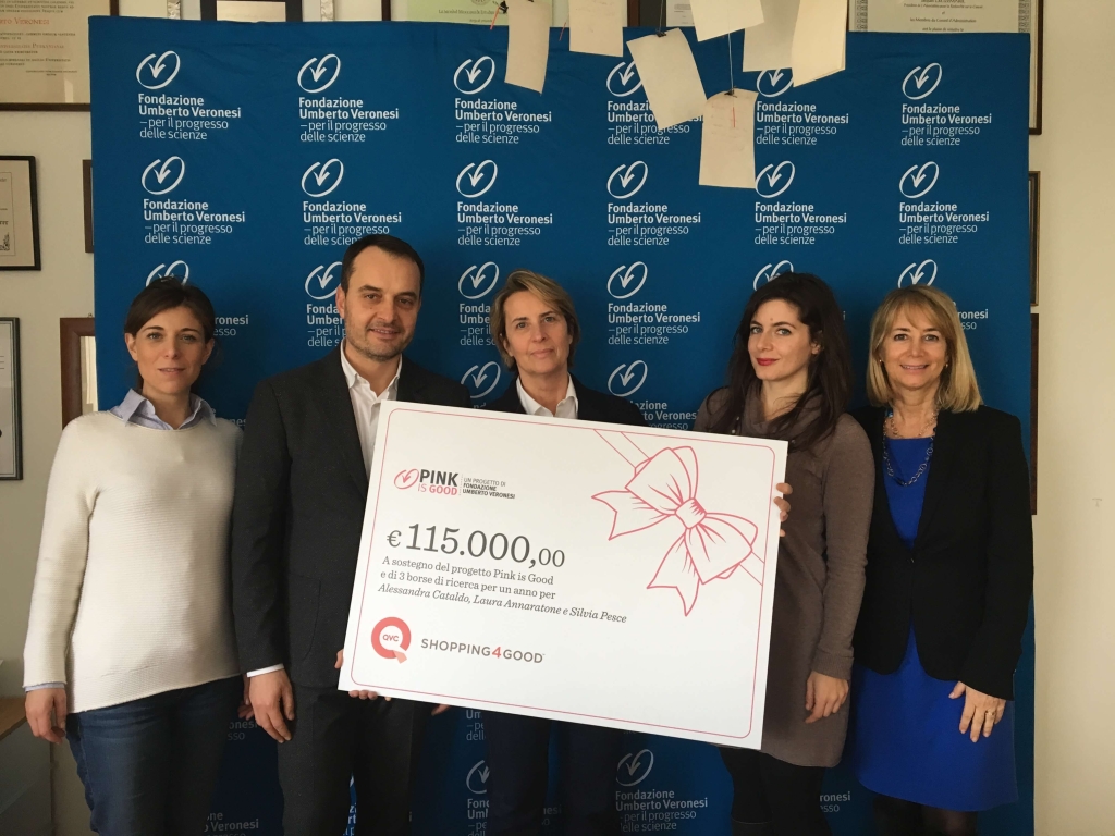 Continua l'impegno di QVC a favore del progetto Pink is Good di Fondazione Umberto Veronesi. Quest'anno sono 115 mila gli euro raccolti che serviranno a finanziare per il 2018 il lavoro di tre ricercatori della Fondazione.