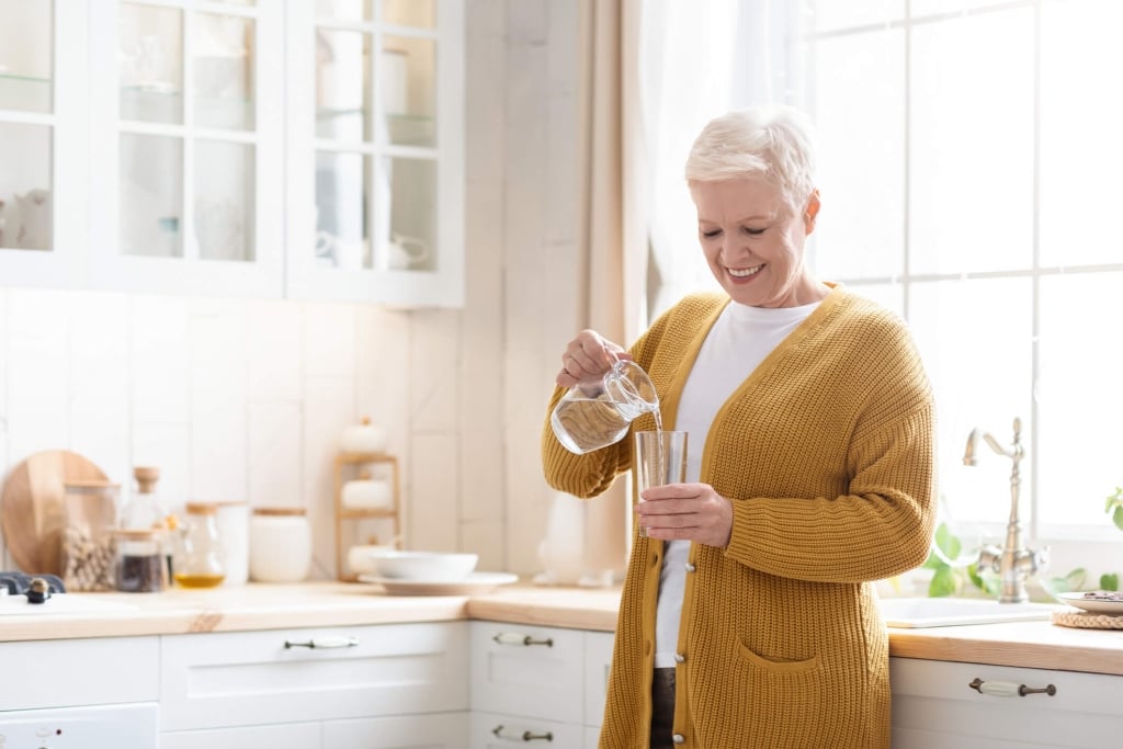 L’anziano deve bere la stessa quantità di acqua del giovane, ma il rischio di disidratazione è molto alto perché si riduce il senso di sete. La disidratazione è inoltre legata a una minore efficienza dei reni nel concentrare le urine, il che porta a eliminare più acqua.