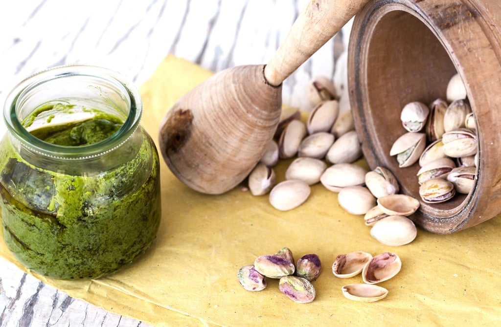 Tritate 50 g di pistacchi salati e sgusciati, unite due grossi cucchiai di grana grattugiato, un pizzico di pepe nero ed emulsionate con olio extravergine di oliva (circa 80 ml). Se siete amanti di una consistenza maggiore allora aggiungete anche 1 cucchiaio di pane grattugiato. Sarà un condimento divino per la vostra pasta (integrale) o per delle verdure grigliate o cotte al vapore!