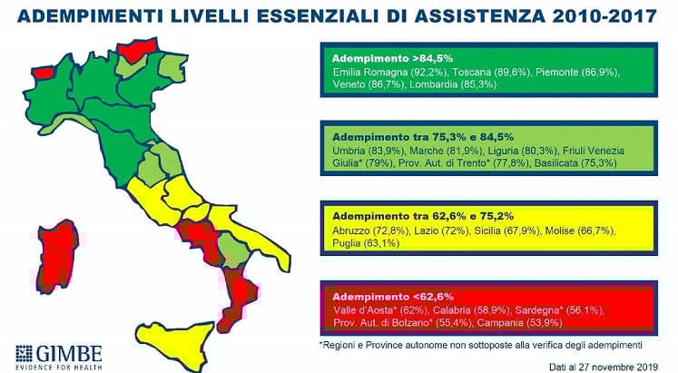 Da qui il lavoro compiuto dalla Fondazione Gimbe, che ha monitorato l'andamento delle prestazioni inserite nei Lea ed erogate tra il 2010 e il 2017. L'istantanea riproduce una forbice «inaccettabile» tra le Regioni. Servizi e prestazioni previsti sono stati forniti, in media, nel 73.7 per cento dei casi per cui vi era un'indicazione. Ma il divario tra le aree del Paese è enorme, se si passa dal 53.9 per cento della Campania al 92.2 per cento dell'Emilia Romagna: che assieme alla Toscana, al Piemonte, al Veneto e alla Lombardia fa parte dell'elenco delle Regioni che trattano meglio i loro abitanti. Nella seconda fascia rientrano i territori che hanno comunque raggiunto la soglia necessaria per essere «promosse» dal Ministero della Salute: Umbria (83.9 per cento), Marche (81.9), Liguria (80.3), Friuli Venezia Giulia (79), Provincia Autonoma di Trento (77.8) e Basilicata (75.3). Tutte Regioni del Nord, a eccezione di quest'ultima. Un dato che conferma l'esistenza di una «questione meridionale in sanità», secondo Nino Cartabellotta, presidente della Fondazione Gimbe. Affermazione supportata dai successivi due elenchi, di cui fanno parte le Regioni inadempienti: Abruzzo (72.8 per cento), Lazio (72), Sicilia (67.9), Molise (66.7), Puglia (63.1), Valle d'Aosta (62), Calabria (58.9), Sardegna (56.1), Provincia Autonoma di Bolzano (55.4) e Campania (53.9).