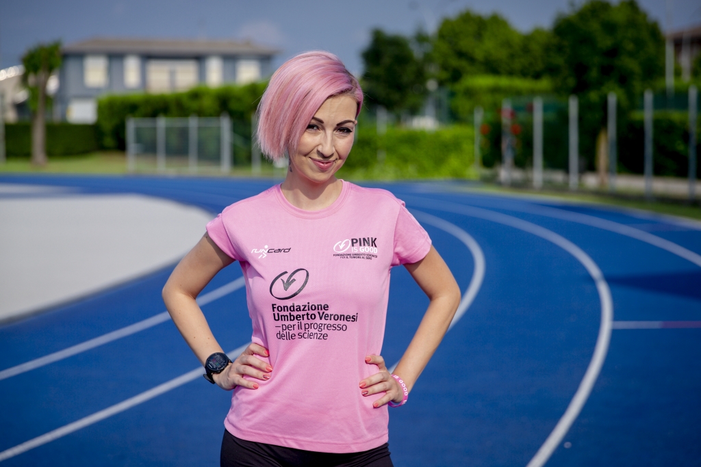 Anna Bellini è stata la referente del gruppo Pink Ambassador 2018 di Verona, donne colpite da tumore che hanno deciso di correre insieme alla Fondazione Umberto Veronesi per sensibilizzare e per sostenere la ricerca sul cancro. «Sono diventata un'ambasciatrice della Fondazione Umberto Veronesi ad aprile e ho cominciato a correre. Qui a Verona nel 2018 eravamo in dieci ed io ero la più piccola. Il cancro al seno è arrivato quando avevo 32 anni. Per fortuna avevo già due bambini. Lo sottolineo nel senso che poi sono entrata in menopausa forzata, non avrei più potuto averne. Per cinque anni mi sono state prescritte una puntura ormonale ogni 28 giorni e una pastiglia, sempre a base di ormoni, ogni giorno».
