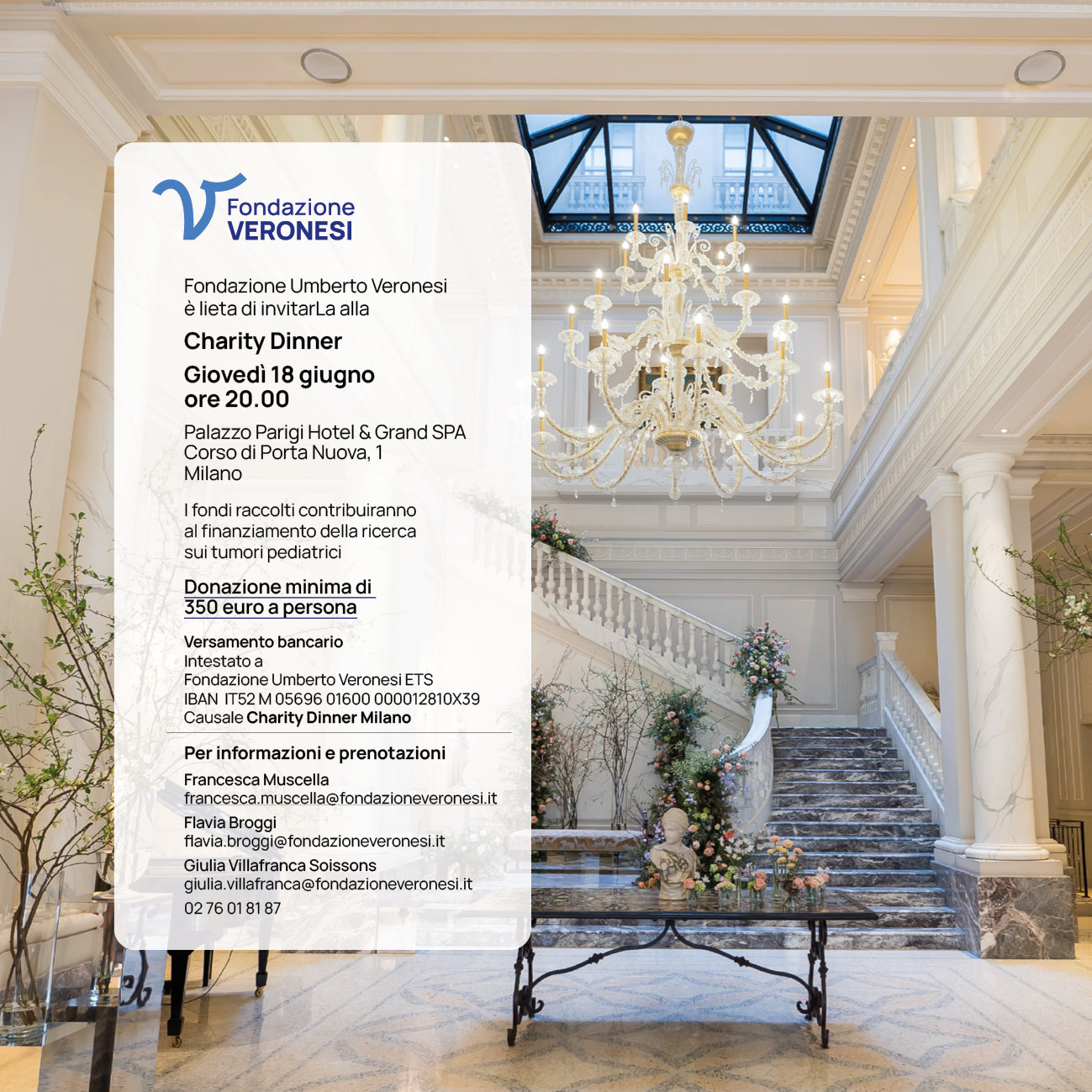 L’appuntamento con l’annuale Charity Dinner di Fondazione Veronesi, a sostegno dell'oncologia pediatrica, si terrà giovedì 18 giugno alle ore 20.00 nelle Sale di Palazzo Parigi.