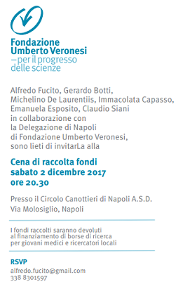 Nuovo appuntamento di raccolta fondi per la Fondazione Umberto Veronesi. Alfredo Fucito, Gerardo Botti, Michelino De Laurentiis, Immacolata Capasso, Emanuela Esposito, Claudio Siani, in collaborazione con la delegazione napoletana della Fondazione rappresentata dall'avvovato Maurizio De Tilla, organizzano una cena di raccolta fondi con live music presso il Circolo Canottieri di Napoli A.S.D. di via Molosiglio.