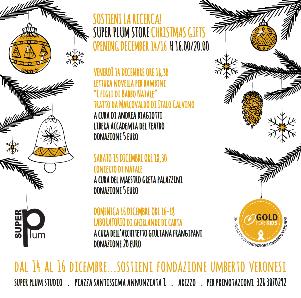 Tre giorni per sostenere la ricerca in oncologia pediatrica. Dal 14 al 16 dicembre Arezzo si è tinta di giallo per il progetto "Gold for Kids" di Fondazione Veronesi. La delegazione aretina ha organizzato presso il Super Plum Store Christmas Gifts tre appuntamenti che sono serviti a raccogliere fondi da dedicare alla ricerca contro i tumori dei più piccoli.