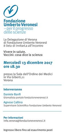 Si terrà mercoledì 13 dicembre l'appuntamento veronese con «Vaccini: cosa dice la scienza», il ciclo di incontri divulgativi dalla Fondazione Umberto Veronesi in diverse città italiane. L'appuntamento, organizzato dalla delegazione veronese della Fondazione, si terrà all'interno della Sala dell’Ordine dei Medici, in via Giberti 11.
