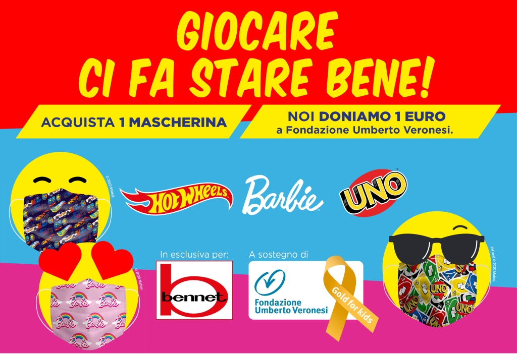 È questa l’idea che ha avuto Bennet, azienda leader nel mercato degli ipermercati e dei centri commerciali, con sedi in tutto il Nord Italia. A partire da metà dicembre, in tutti i punti vendita Bennet e su bennet.com saranno in vendita le mascherine per bambini realizzate in collaborazione con Mattel. Per ogni mascherina venduta, verrà devoluto un euro a Gold for Kids, il progetto con cui Fondazione Umberto Veronesi sostiene la ricerca sui tumori pediatrici. Le mascherine sono realizzate in cotone 100% doppio strato: lo strato esterno è idrorepellente con trattamento antigoccia e sono quindi lavabili e riutilizzabili. Tre i modelli disponibili: uno dedicato a Barbie, la fashion doll più famosa di sempre, Hot Wheels e al gioco di carte UNO.