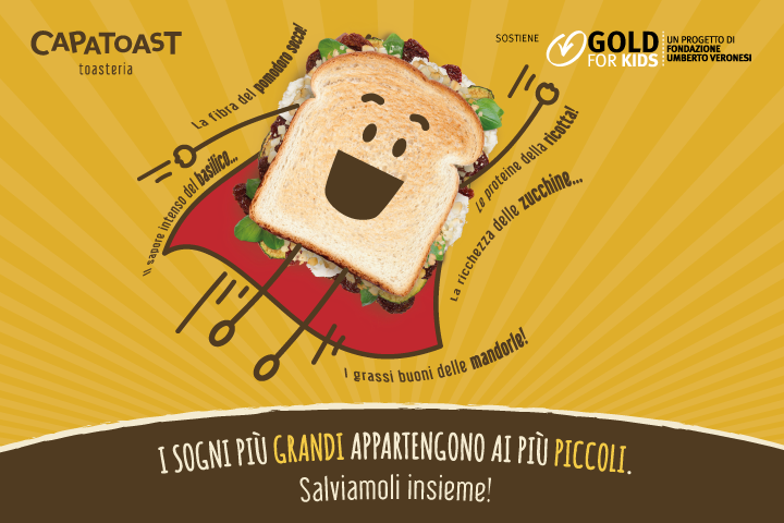 Capatoast sostiene la Fondazione Umberto Veronesi e il progetto Gold for Kids dedicato all'oncologia pediatrica. Lo fa promuovendo un prodotto gustoso e salutare, e sostenendo i sogni più preziosi, quelli dei bambini e dei ragazzi. Da questa condivisione valoriale nasce il Super Toast, che rispetta le linee guida della Fondazione Umberto Veronesi per una sana alimentazione, e nel quale ogni singolo ingrediente è scelto con cura e dedizione: