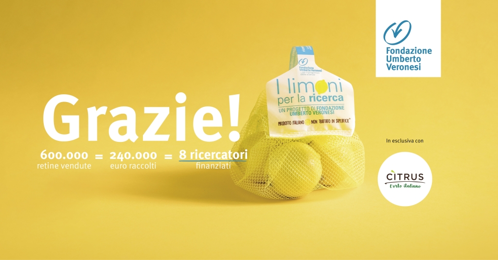 «Grazie alla grande sensibilità dei consumatori e delle sempre più numerose insegne che hanno sostenuto questa nuova edizione, potremo finanziare il lavoro di otto eccellenti ricercatori che sono impegnati a trovare soluzioni di cura più efficaci per i pazienti di oggi e di domani - afferma Monica Ramaioli, Direttore Generale di Fondazione Umberto Veronesi - I limoni per la ricerca è un progetto che vede come prezioso partner l’azienda italiana Citrus, che con grande dedizione durante questi anni ha creduto fortemente nell’importanza di sostenere la ricerca scientifica e la corretta divulgazione a beneficio tutti noi».