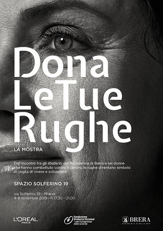 Non più soltanto una campagna. «Dona le tue rughe», l'iniziativa di L’Oréal Paris ideata da McCann Worldgroup Italia con Fondazione Umberto Veronesi, aggiunge un nuovo capitolo alla sua storia: una mostra per omaggiare le donne che hanno affrontato e superato un tumore. A Milano, nello Spazio Solferino 19, dal 4 all'8 novembre è possibile apprezzare le fotografie, le installazioni e i disegni realizzati da 13 giovani promettenti artisti dell’Accademia di Belle Arti di Brera. «Il progetto si relaziona con qualcosa che misura e trattiene il tempo, che segna il passo della vita e della forza necessaria che occorre a tracciarne il percorso - afferma Maria Cristina Galli, vicedirettore dell’Accademia di Belle Arti di Brera -. Il tempo, inteso come un processo di rinascita quotidiana e l'inizio di una nuova avventura, è assieme alle protagoniste l'attore fondamentale di questa iniziativa».