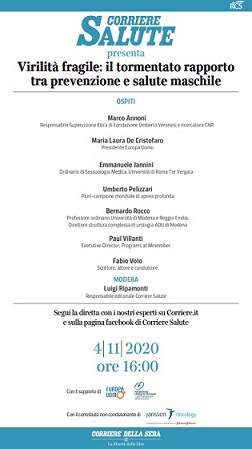 Da qui l'idea di «affiancare» il Corriere della Sera in un talk-show che punta a presentare quelli che sono i problemi che possono presentarsi nella vita di un uomo e a spiegare perché occorra affrontarli fin da subito, senza mettere la testa sotto la sabbia. L'appuntamento è previsto per mercoledì 4 novembre (ore 16) in diretta sul sito e sulla pagina Facebook del quotidiano.