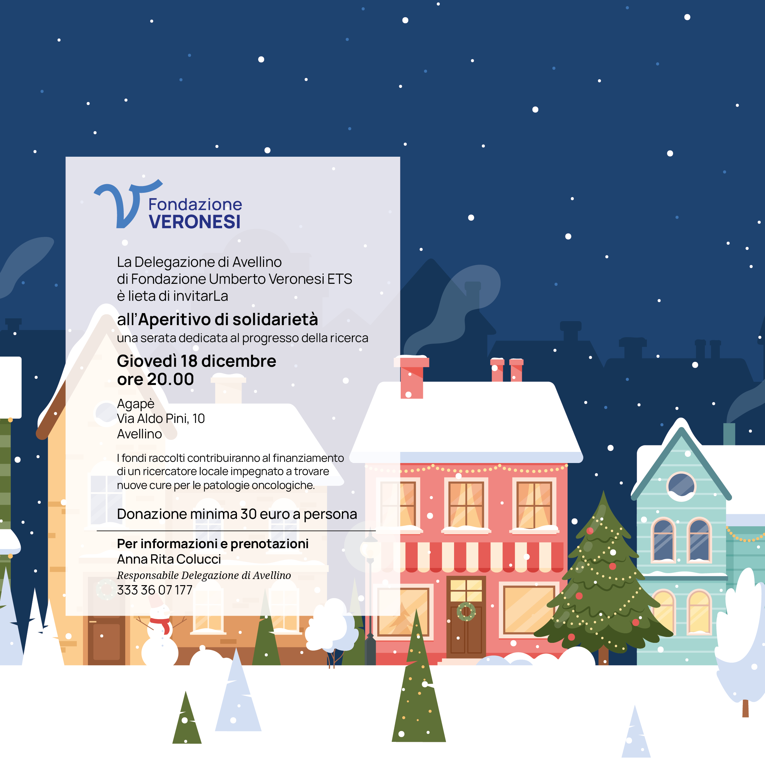 La Delegazione di Avellino di Fondazione Veronesi, guidata da Anna Rita Colucci, organizza un Aperitivo di solidarietà, dedicato al progresso della ricerca. L'appuntamento è giovedì 18 dicembre alle ore 20.00 presso il bistrot Agapè, in Via Aldo Pini 10, ad Avellino.
