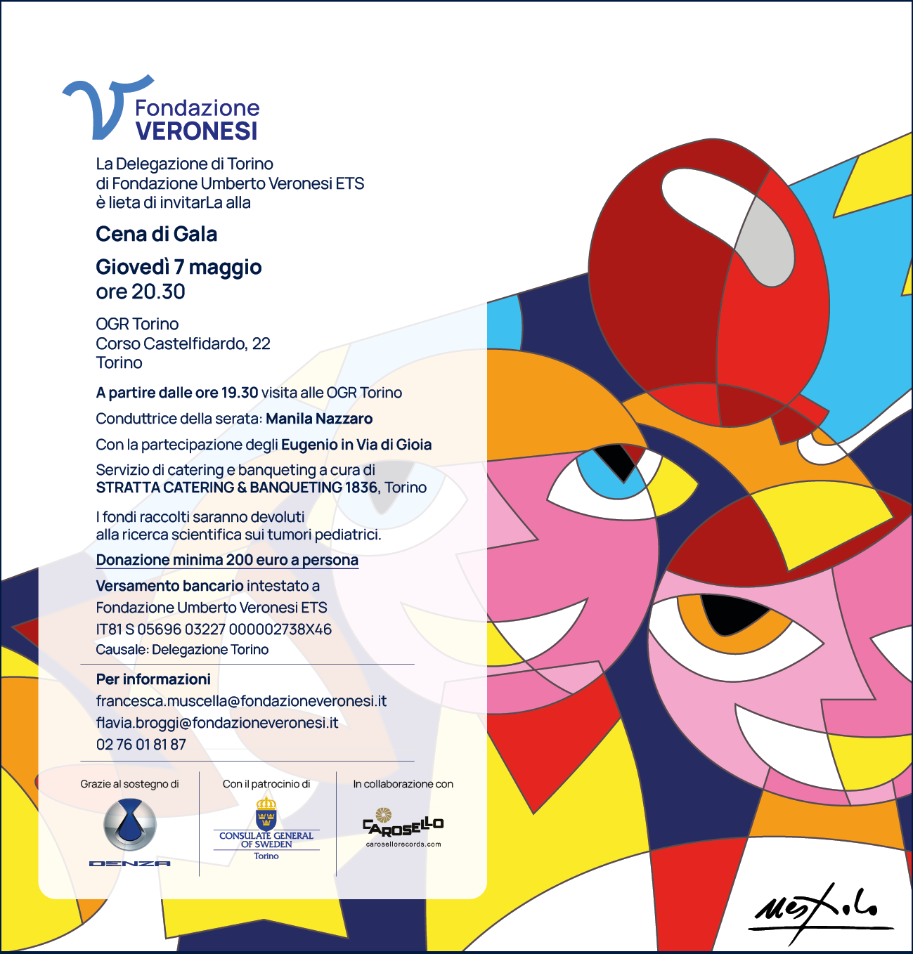 La Delegazione di Torino di Fondazione Veronesi, guidata da Giovanna Ardoino, organizza una Cena di Gala per sostenere la ricerca scientifica sui tumori pediatrici. L'appuntamento è previsto per giovedì 7 maggio alle ore 20.30 presso le Officine Grandi Riparazioni (OGR) di Torino, Corso Castelfidardo 22. A partire dalle ore 19.30 sarà inoltre possibile fare visita alle OGR Torino.