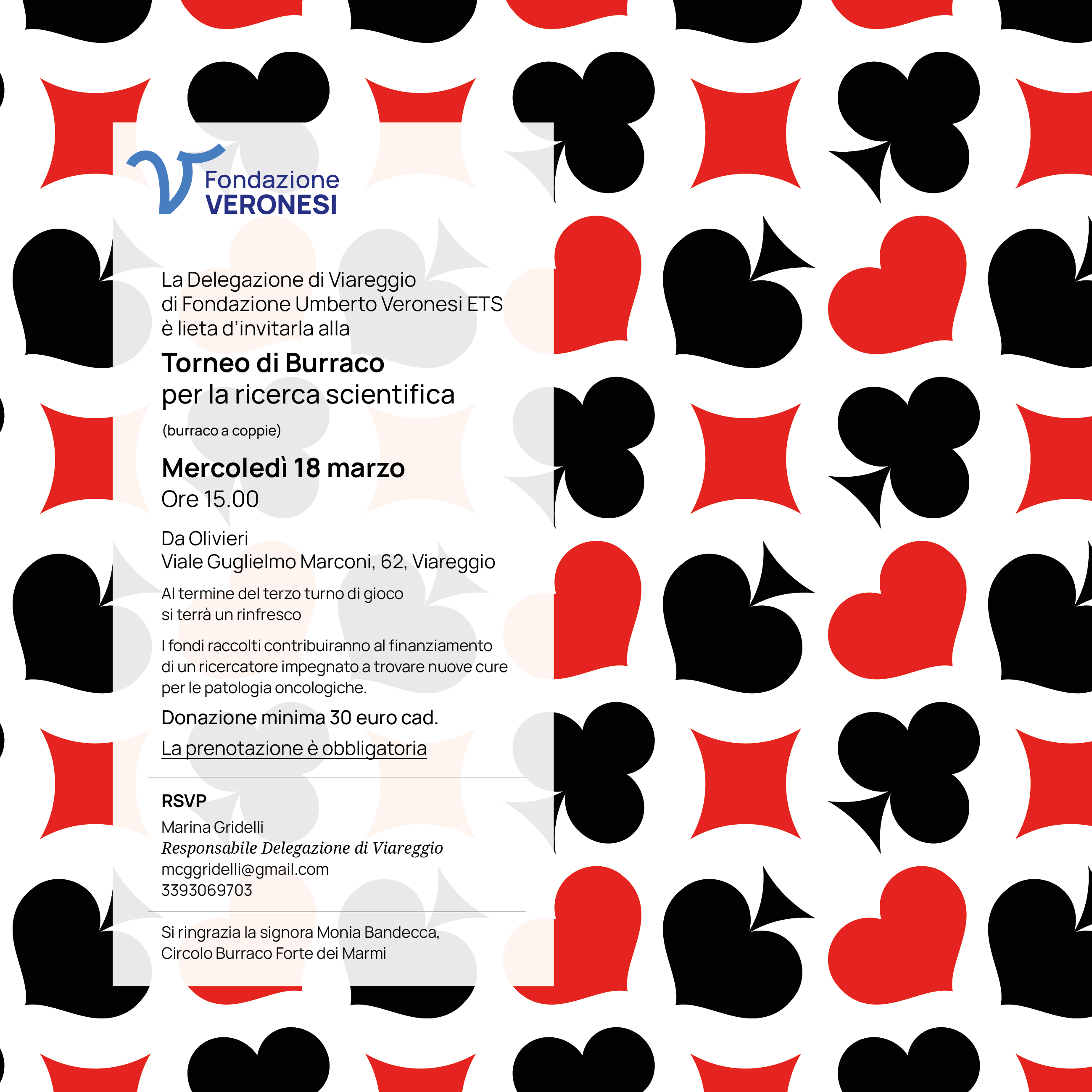 La Delegazione di Viareggio di Fondazione Veronesi, guidata da Marina Gridelli, organizza un nuovo Torneo di Burraco a coppie a sostegno della ricerca scientifica. L'appuntamento è previsto per mercoledì 18 marzo alle ore 15.00 da Olivieri, Viale Guglielmo Marconi, 62, Viareggio.