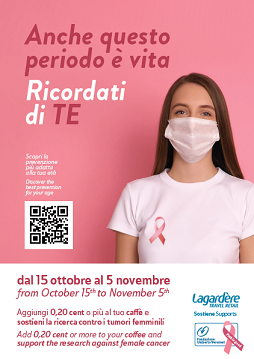 Anche quest’anno, dal 15 ottobre al 5 novembre, nei punti vendita Food & Beverage e Travel Essential, sarà data ai clienti la possibilità di donare 20 centesimi (o più) a fronte dell’acquisto di prodotti di caffetteria o di bottiglie di acqua. I ricavati aiuteranno a promuovere la prevenzione e favorire la conoscenza di una tematica tanto importante, in modo serio e accurato.