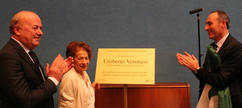 «Umberto Veronesi è stato figlio di questo istituto per diventarne padre, sapendo come associare la ricerca e la clinica a garanzia della migliore terapia e, peraltro, decretandola tale solo quando capace di soddisfare i bisogni a tutto tondo della persona malata - ha affermato Enzo Lucchini, presidente dell'Istituto -. In questa culla di giganti, quale era e continua ad essere l’Istituto Nazionale dei Tumori, ha predetto ciò che oggi è in atto nel Sistema Sanitario Lombardo: il passaggio epocale dal curare al prendersi cura del paziente». Per Veronesi «è giunto il momento di tornare a casa», ha aggiunto Giovanni Apolone, direttore scientifico dell'Istituto. «Lui ha dato tanto a noi, ma anche questo istituto ha dato tanto a lui». Alla cerimonia era presente anche Paolo Veronesi, presidente della Fondazione e direttore dell'unità di senologia chirurgica dell'Istituto Europeo di Oncologia. «Ricordare papà non è mai semplice, ma mi fa piacere farlo in questa sede, dove quarant'anni fa cambiò per sempre il corso della lotta al tumore al seno».