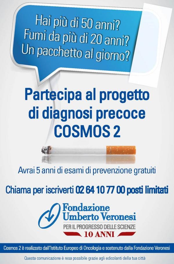 Nel primo, invitiamo i forti fumatori a partecipare a Cosmos 2, un progetto di ricerca che potrà salvare la vita a migliaia di persone. Il tumore al polmone è, infatti, uno dei più temibili e individuarlo nella fase iniziale può aiutare a sconfiggerlo.