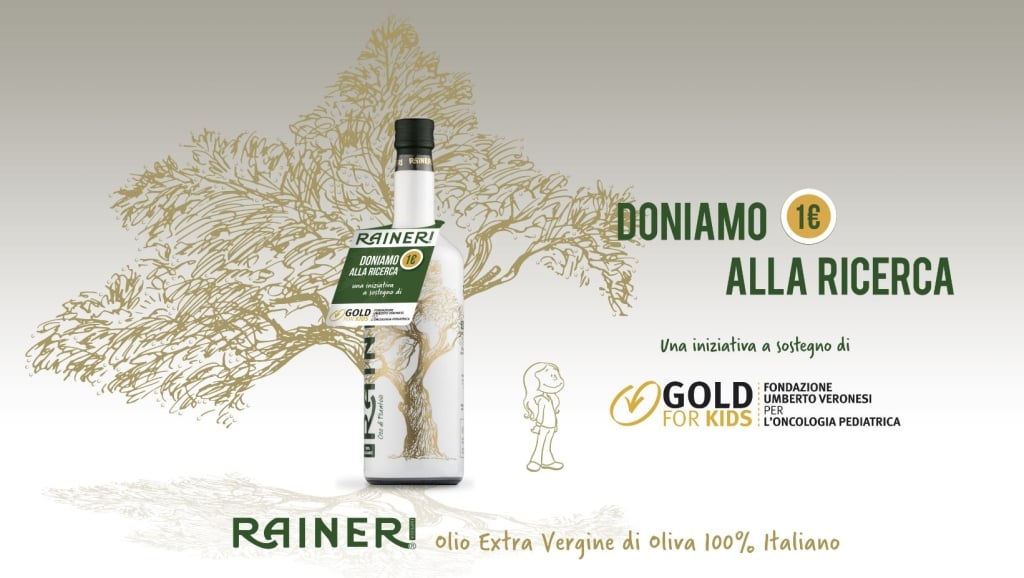 Per tutto il 2018 l’Azienda Raineri finanzierà l’assegnazione di una borsa di studio ad un ricercatore scientifico nel campo dell’oncologia pediatrica a sostegno del Progetto Gold for Kids della Fondazione Umberto Veronesi, donando un euro per ogni bottiglia venduta di Olio Extra Vergine di Oliva.