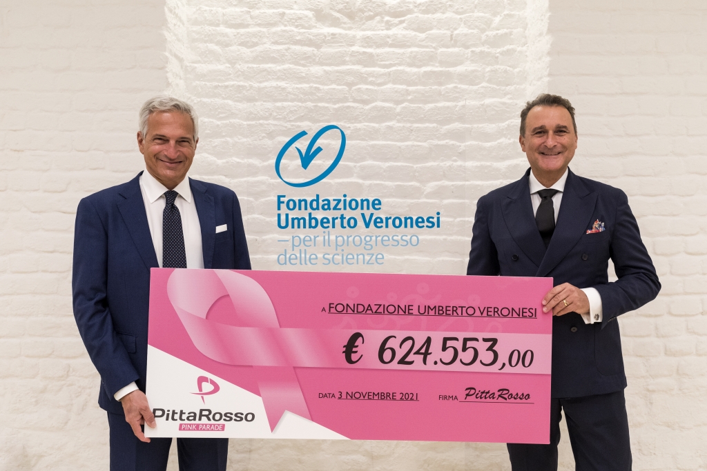 Nella giornata di ieri, 3 novembre, l'amministratore delegato di PittaRosso, Marcello Pace, si è recato presso la nostra sede per consegnare ufficialmente al nostro presidente, Paolo Veronesi, un assegno gigante... non solo nelle dimensioni! L'importante importo raccolto è il risultato, oltre che delle iscrizioni all’evento, anche delle donazioni raccolte nei punti vendita della rete PittaRosso nei quattro mesi precedenti e dei contributi delle aziende partner sostenitrici; un’attività che ha coinvolto tutto il personale impegnato in prima persona a veicolare ai clienti il messaggio di quanto sia importante il sostegno alla ricerca scientifica d’eccellenza. Grazie all’importante risultato di quest’anno, il totale dei fondi raccolti da PittaRosso negli 8 anni di vita del progetto PittaRosso Pink Parade a sostegno della ricerca scientifica sui tumori femminili ammonta ad oggi a quasi 5 milioni di euro.