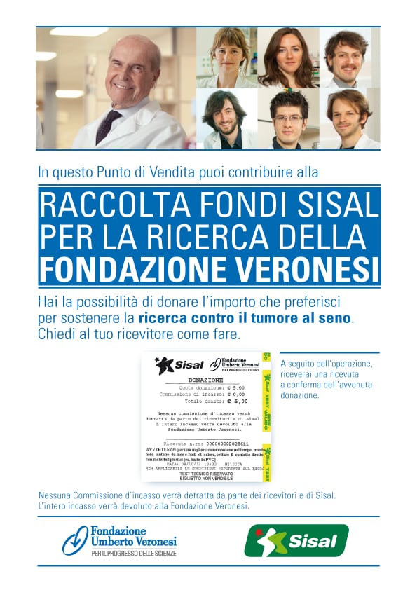 Per sostenere gli studi contro la malattia e sensibilizzare l’opinione pubblica sull’importanza del sostegno privato alla ricerca, Sisal ha scelto di promuovere una raccolta fondi a favore della Fondazione Umberto Veronesi.