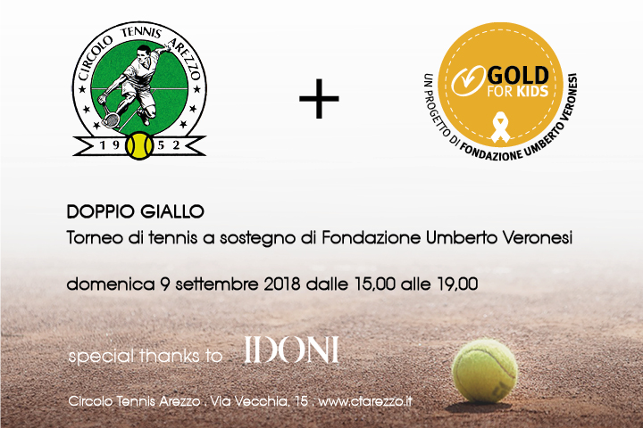Domenica 9 settembre 2018 – dalle 15 alle 19 – presso Il Circolo Tennis Arezzo in Via Vecchia 15 si terrà il Torneo “Doppio Giallo” aperto a giocatori di tutte le età e di ogni livello! I fondi raccolti mediante le quote di iscrizione (15 euro a persona) saranno interamente devoluti a Gold for Kids, il progetto di Fondazione Umberto Veronesi che rappresenta un impegno concreto nel campo dell'oncologia pediatrica, per sostenere le cure mediche, promuovere l'informazione e la divulgazione scientifica.