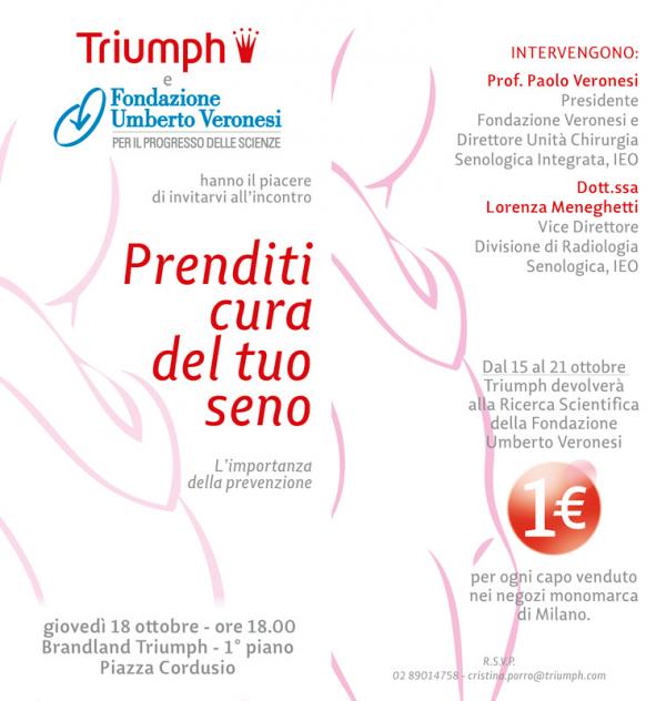 "Prenditi cura del tuo seno": questo il titolo dell'incontro organizzato da Fondazione Veronesi in collaborazione con Triumph, prestigioso marchio internazionale, il 18 ottobre presso il Brandland Triumph in Piazza Cordusio a Milano. A ricordare l'importanza della prevenzione nel campo del tumore al seno il Professor Paolo Veronesi, Presidente della Fondazione Veronesi e Direttore dell'Unità di Chirurgia Senologica Integrata dell'Istituto Europero di Oncologia, e la Dott.ssa Lorenza Meneghetti, Vice Direttore della Divisione di Radiologia Senologica dell'Istituto Europeo di Oncologia.
