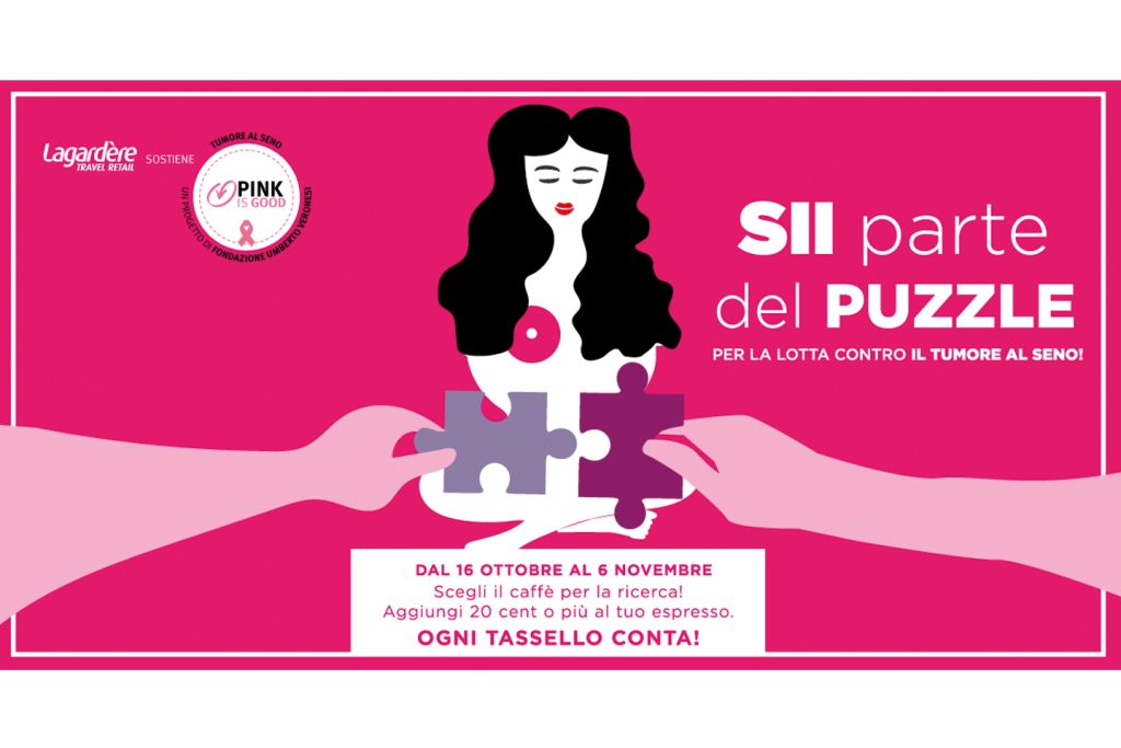 “Sii parte del Puzzle: scegli il caffè per la ricerca! Ogni tassello conta!” con questo motto Lagardère Travel Retail sostiene Pink is Good, il progetto di Fondazione Umberto Veronesi dedicato alla ricerca sui tumori femminili. Nel corso del mese dedicato alla lotta al tumore al seno, dal 16 ottobre al 6 novembre Lagardère Travel Retail darà ai propri clienti la possibilità di donare 0,20 € o più, a fronte dell’acquisto di un caffè.