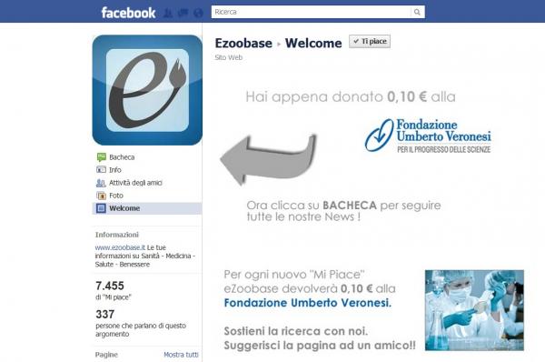 eZoobase, sito di informazioni su Sanità, Medicina, Salute e Benessere sostiene la ricerca della Fondazione Umberto Veronesi con una iniziativa sui social network: per ogni nuovo MI PIACE sulla pagina Facebook di eZoobase, quest’ultima donerà 0,10 € alla Fondazione Umberto Veronesi.