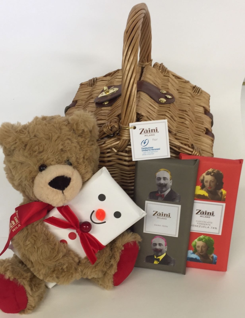 Un modo per dare ai propri regali di Natale un significato, oltre che gioioso, anche durevole e profondo, è scegliere un dono solidale. La Luigi Zaini, la più antica fabbrica di cioccolato di Milano, quest’anno ha creato per la Fondazione Umberto Veronesi un kit composto da un cestino in vimini da picnic, un orsetto di peluche e tre tavolette di cioccolato fondente con, rispettivamente, il 70, il 74 e il 100 per cento di cacao.